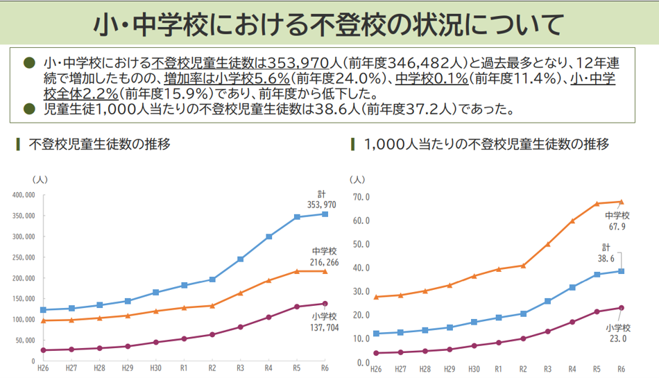 10月31日に文部科学省が発表した2024年度の『不登校』(※1)数は、小中学生で353,970人。前年度から7,488人(2.2%)増加し、過去最多となりました。