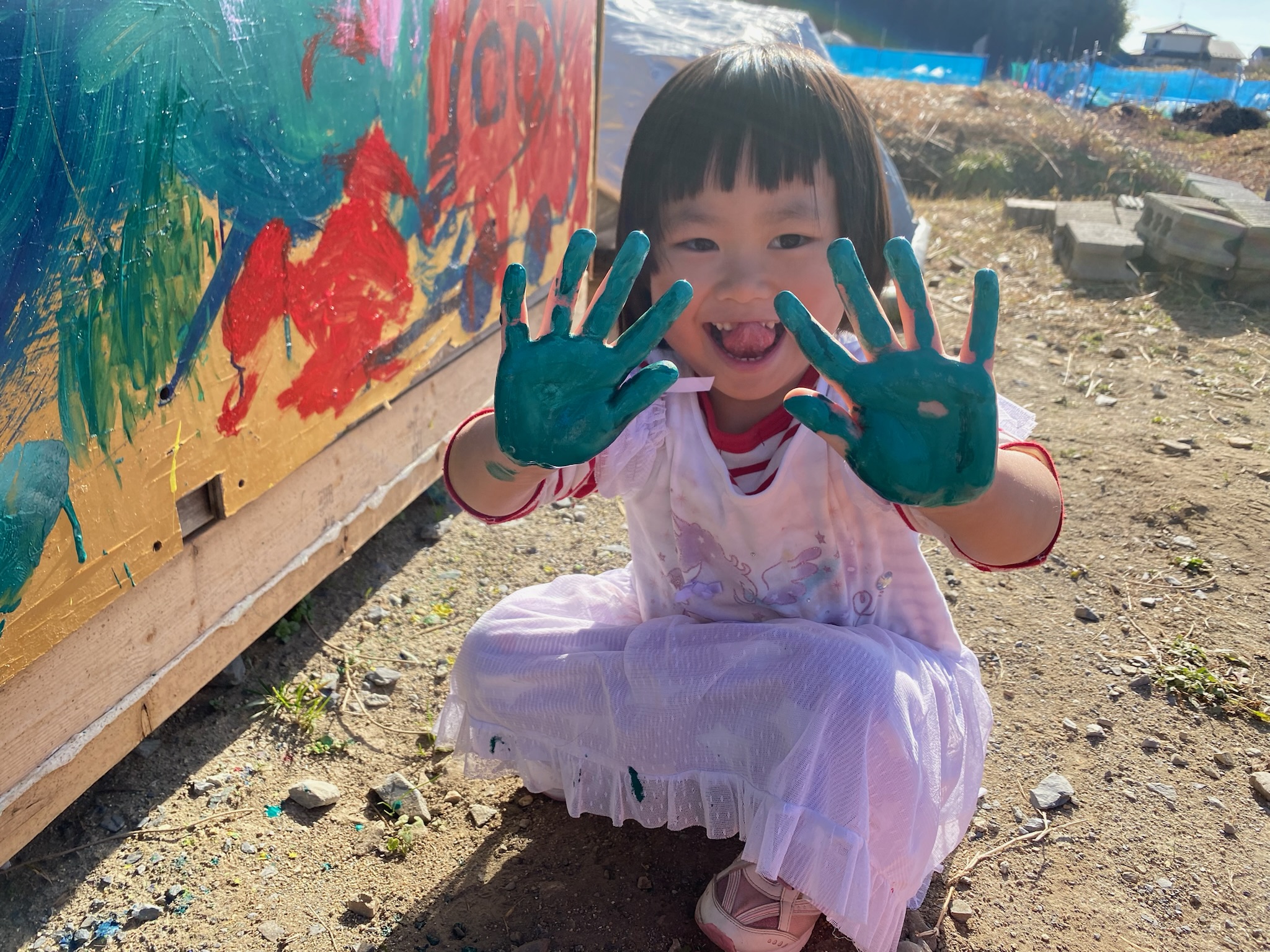 未就学くらいの小さな女の子が、大きな遊具にペンキでお絵描きを始めました。