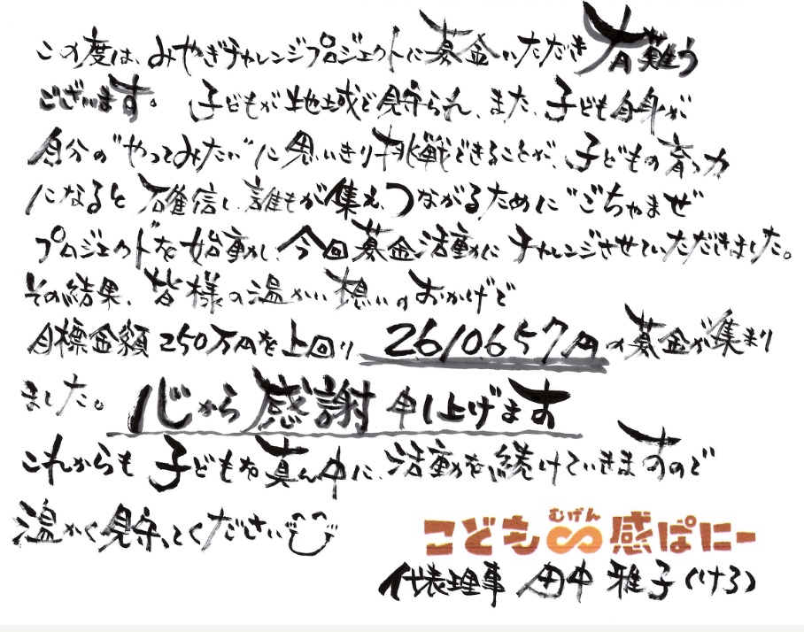 目標額を達成出来たのも大変嬉しいことですが、それ以上に、「こんなにも応援してくれる人がいるんだ」ということに心が震えています。